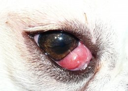 Een cherry-eye bij de hond ontstaat door zwelling van de traanklier die zich achter het derde ooglid bevindt. Door de zwelling wordt de traanklier opeens zichtbaar boven het derde ooglid. Soms vermindert de zwelling en zakt de traanklier weer terug in zijn normale positie achter het derde ooglid, maar meestal is de zwelling van de traanklier zo heftig dat deze continu uitpuilt boven het derde ooglid. Door het uitpuilen van de traanklier wordt het slijmvlies continu blootgesteld aan uitdroging en vuil, waardoor er een ontsteking en beschadiging kan optreden.